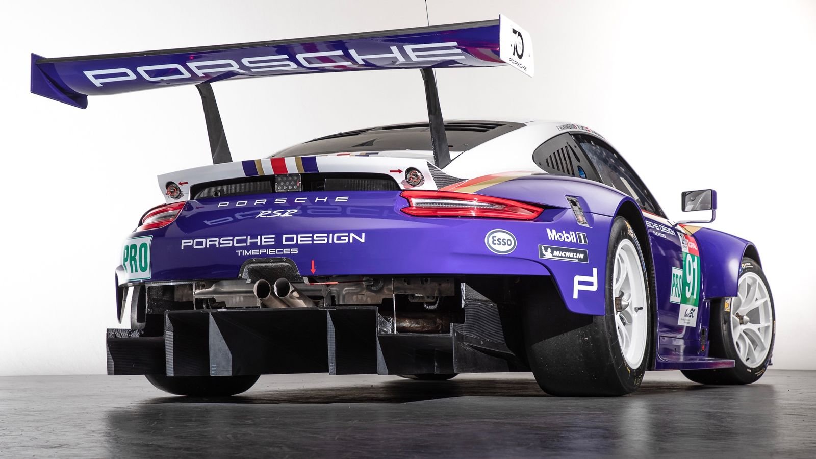 The number 91 RSR recreates the Rothmans tobacco paint scheme worn by a multitude of Porsches from an era when Porsches virtually owned endurance racing—a Rothmans-sponsored 959 winning the Paris-Dakar rally in 1986, and Rothmans-liveried 956C models winning the 24 hours of Le Mans outright in '82 and '83, and again in '86 and '87 with 962C models.