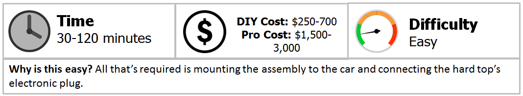 This is done easiest with two people. Carefully slide the top onto the car and tighten the mounting bolts down to 37 ft-lbs.